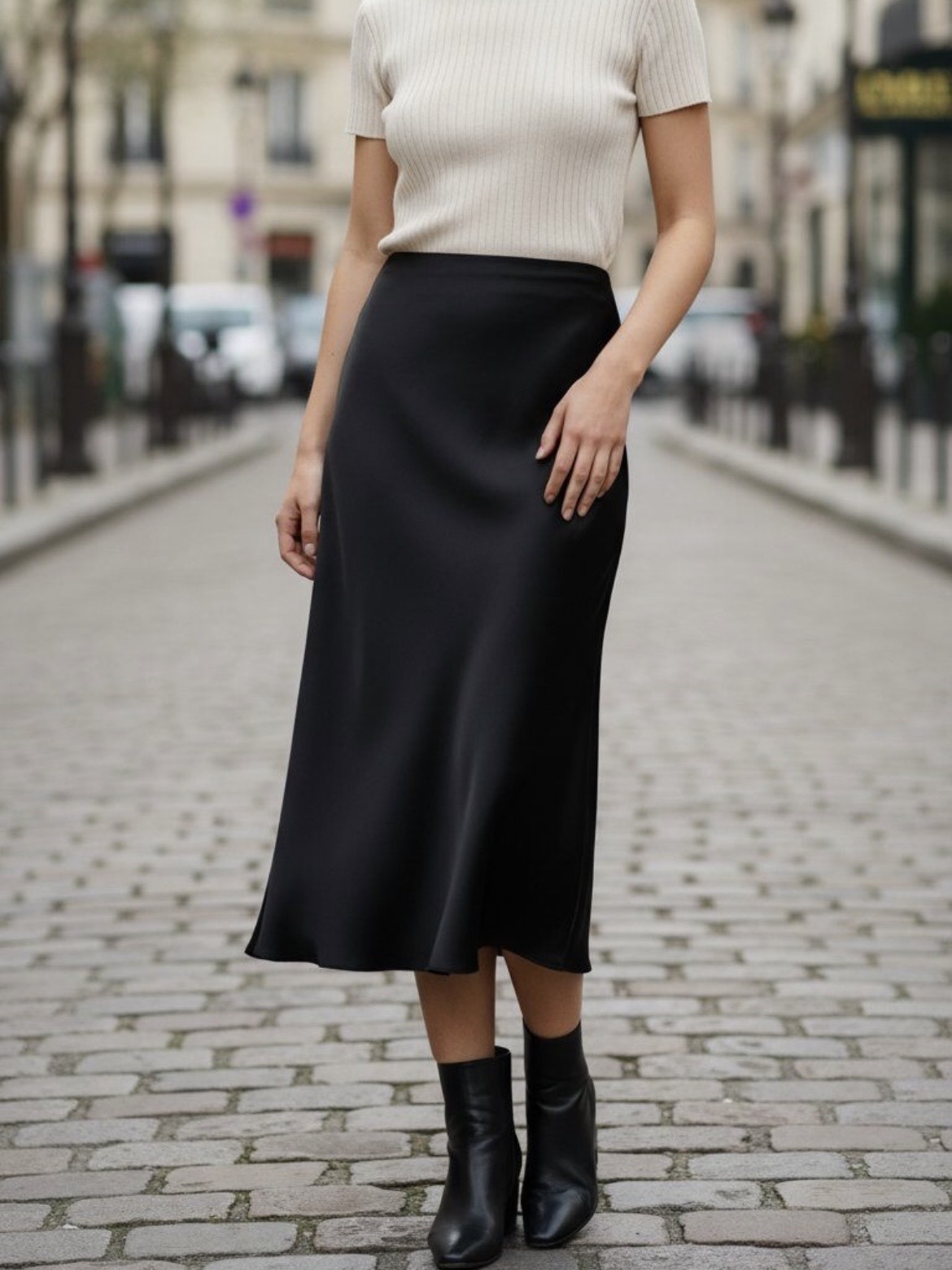 Jupe midi en satin lourd avec taille élastique. Tissu de haute qualité pour un confort optimal. Sa coupe fluide et sa finition élégante en font un choix idéal pour un look chic et décontracté. Parfaite pour associer avec des tops variés. TU= 36-42